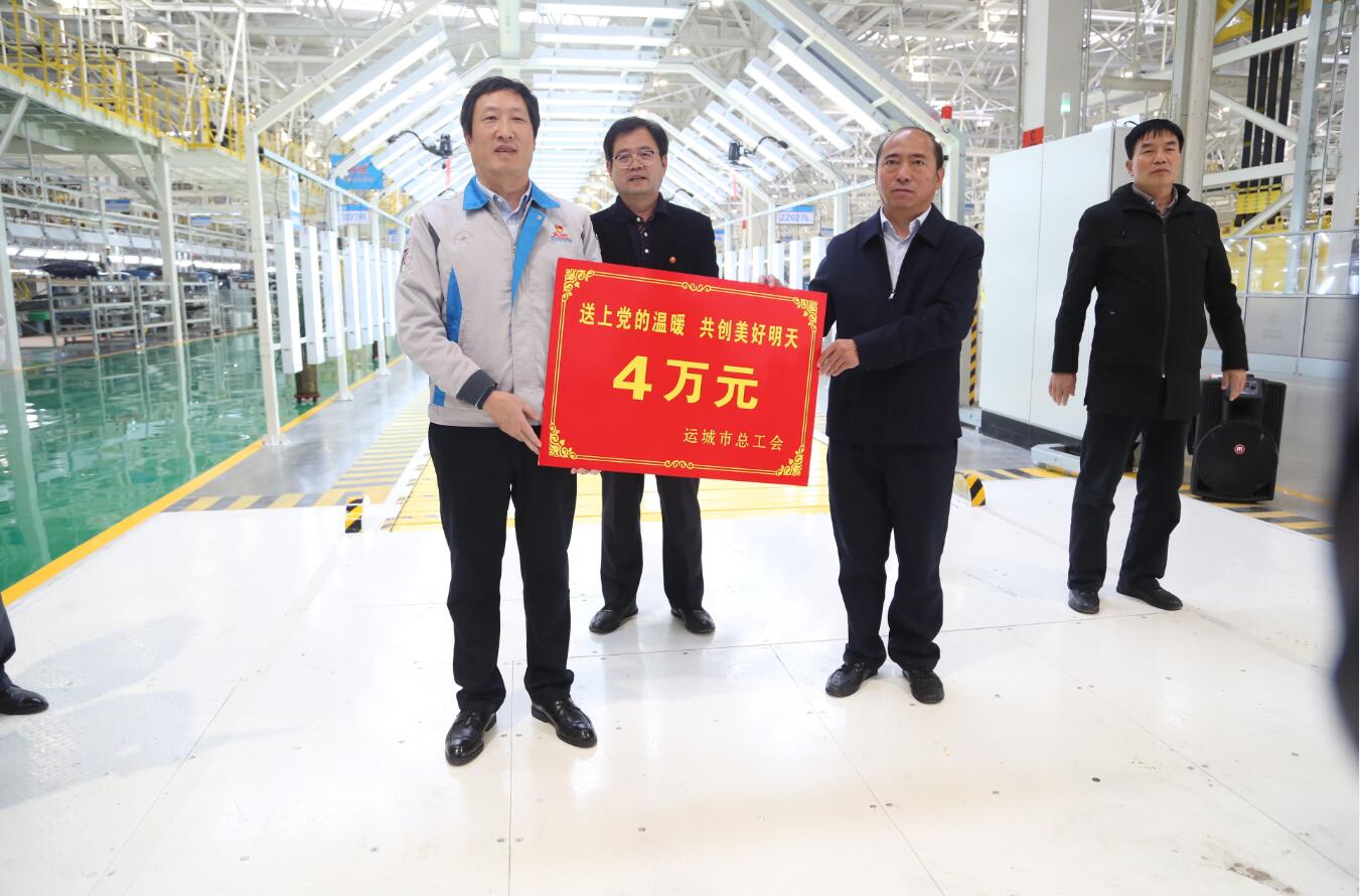 10月16日,運(yùn)城市人大常委會副主任、市總工會主席杜自立,運(yùn)城市總工會黨組書記、常務(wù)副主席梁武軍,運(yùn)城市總工會黨組成員、副主席、一級調(diào)研員秦全發(fā)等領(lǐng)導(dǎo)走訪大運(yùn)新能源汽車生產(chǎn)基地,慰問一線員工并發(fā)放慰問金,送來黨和政府的關(guān)懷。大運(yùn)汽車股份有限公司工會主席孫兆明,工會副主席馬魯堂、周國軍陪同走訪。